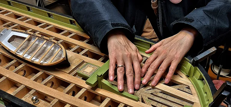 Poul arbejder med en planke ved stævnen som buer i flere retninger. I mange tilfælde udskæres de kompliserede dele i første omgang simpelt karton.