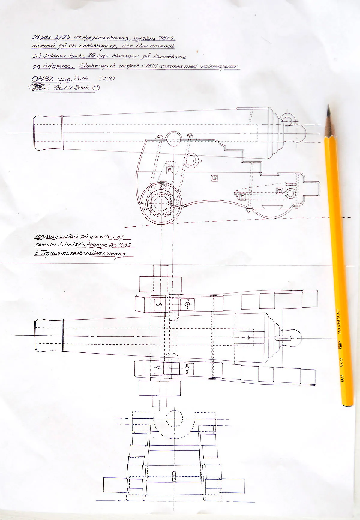 Gennemgang af alt forhåndevørende materiale om bygningen af Schifter korvet fra 1824. Spanteridset skal overføres til lindetræet. Poul er skibsbygger, uddannet på Orlogsværftet og læser i dag skibets linier med et sikkert øje og til brugbare linjer på lindetræet