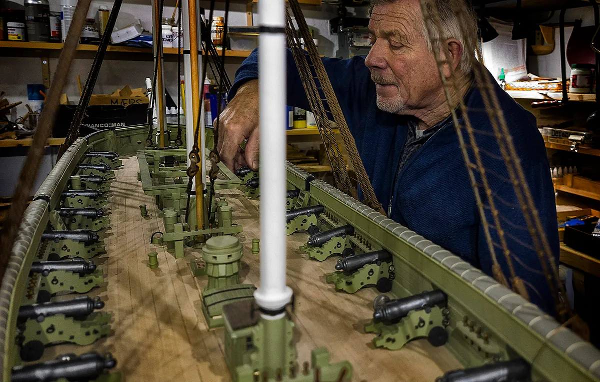 Erik Møller sætter de færdige kanoner på dækket af kirkeskibet Fortuna..