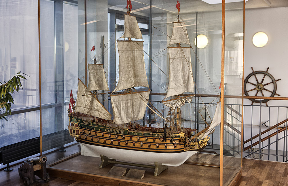 Efter at have afleveret kirkeskibet til Holmens Kirke byggede Otto Dørge denne ny udgave af samme skib til Orlogs-værftets egen model-samling. Helt magen til den første, blot med sejl på, En tredie og senere udgave findes, bygget på bestilling til et flådemuseum i Washington
