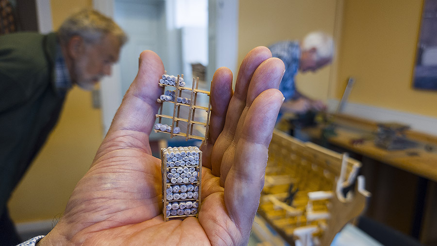 Modellen udføres så skibets indre og dets konstruktive elementer, dvs. køl, stævntømmer, knæ, bjælker og spanternes indbyrdes placering vises. Dækkene vil få forskellig bredde for at sikre, at de ikke dækker for hinanden.