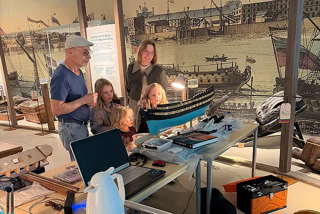 Brian Fatum fortæller om arbejdet med den åbne model af HMS Defence under besøget på Strandingsmueum St. George i Påsken 2026. Foto: Tove Christoffersen