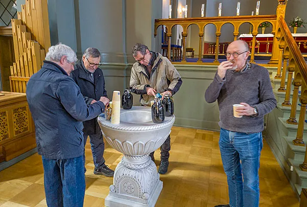 Laugets medlemmer skaber trængsel omkring døbefonten..
