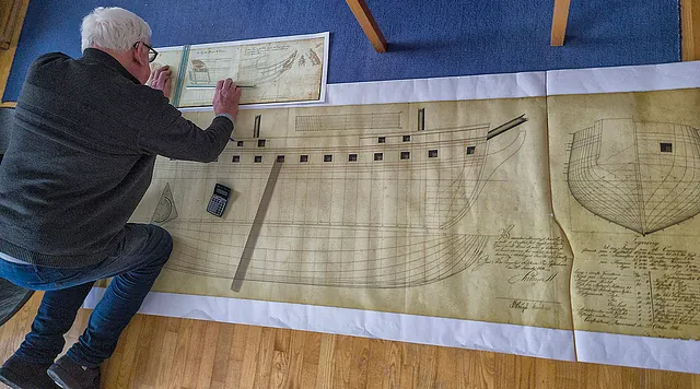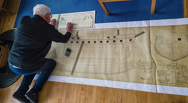 Otto Dørges genfundne model af fregatten Rota afhentet med henblik på renovering i arresten på Nyholm.