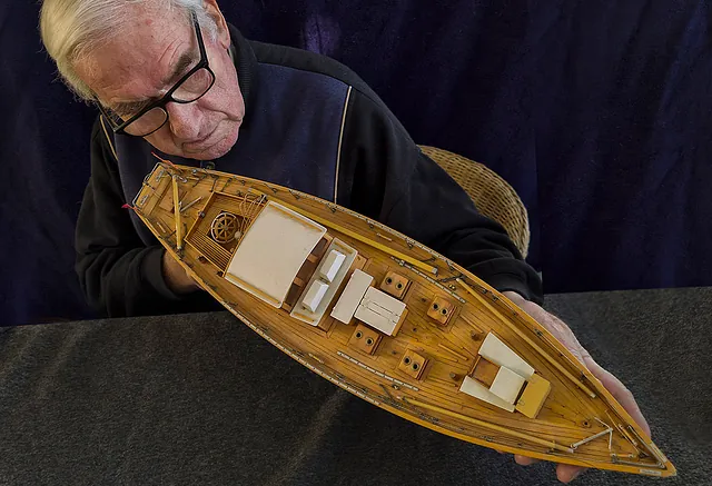 Poul med modellen af sejlkutteren Svanen, som udover udbedring ad sine "stød-skader" også vil få nye sejl.