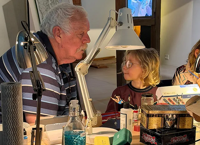 Til venstre er det Brian Fatum der fortæller om arbejdet med den åbne model af HMS Defence, mens Ingolf Christoffersen herover sætter en ung gæst i gang med at male figurer. Foto: Brian Fatum og Tove Christoffersen