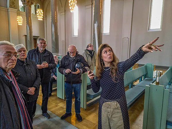 Kordegn Trine Kiib Hecht viser og forklarer ganske fremragende om Sankt Pauls Kirkes italienske tilsnit og smukke dekorationer. Ole Frantzen Hans Christian Bjerg,, Erik Møller, og Henrik Pedersen og alle os andre blev sat ind i kirkeskibets farvevalg og detaljer,