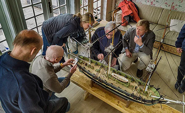 Besøg af kirkerådet fra Frederikskirken, den danske kirke i Paris, ved Dorthe Boby Skovhuus og formand Ib Christian Pedersen, begge med ledsager.e Det blev en eftermiddag i hjemmeværkstedet i Vedbæk hvor de fik det første blik på OMBLs model af korvetten Fortuna, der snart skal ophænges som kirkeskib i Frederikskirken.